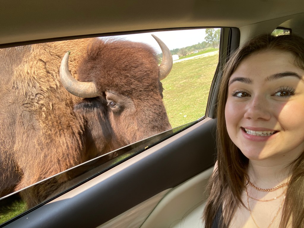You literally drive through small herds of animals (bison, ostriches, emus, llamas, yaks, donkeys, camels etc) with a bucket of food. The animals will walk up to your car, stick their heads inside and snarf down all of the food in your bucket.